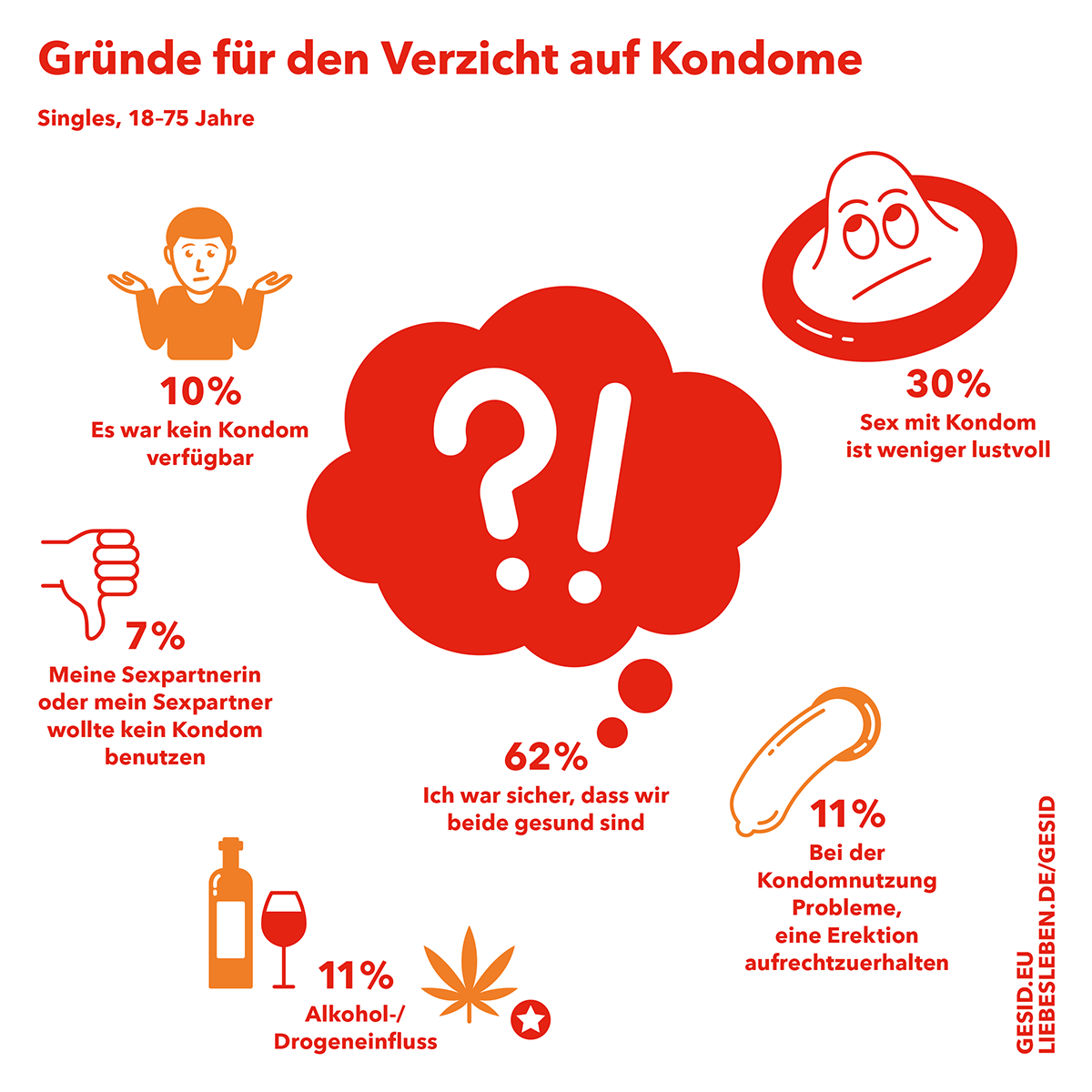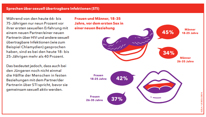 Das Risiko für sexuell übertragbare Infektionen lässt sich am besten durch die Nutzung von Kondomen oder auch Femidomen (Frauenkondom) verringern. Nicht vergessen werden sollte jedoch, dass die dabei ungeschützten, bzw. freiliegenden Schleimhäute und Hautbereiche nicht vor einer Ansteckung mit bestimmten STI geschützt sind. Das Kondom sollte übrigens nicht nur beim Vaginalsex, sondern auch beim Oral- und Analsex verwendet werden. In der GeSiD-Studie 2020 (Gesundheit und Sexualität in Deutschland) der BZgA wurde herausgefunden, dass weniger als die Hälfte der Befragten in festen Beziehungen mit dem Partner oder der Partnerin über sexuell übertragbare Infektionen spricht, bevor sie das erste Mal miteinander schlafen. Unterschiede gibt es dabei in den Altersgruppen (Jüngere sprechen mehr darüber als Ältere) und homosexuelle Paare sprechen häufiger darüber als heterosexuelle.